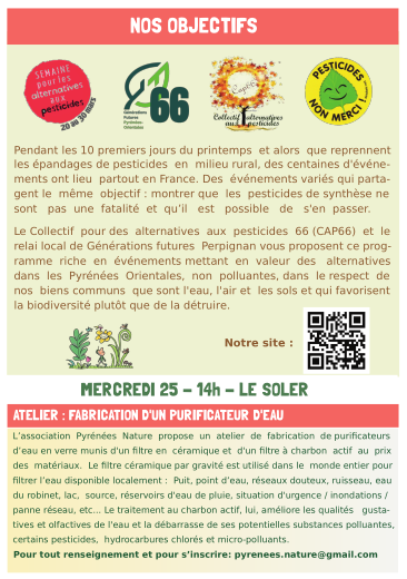 Alerter sur les risques sanitaires et environnementaux liés à l’utilisation des pesticides.Informer sur l’ implication directe des produits chimiques dans le développement des cancers et des maladies dégénératives, sur le fait que la pollution des nappes et des cours d’eau pose de graves problèmes, notamment la qualité de l'eau des captages publics et qu’ il est donc urgent de changer de pratiques.